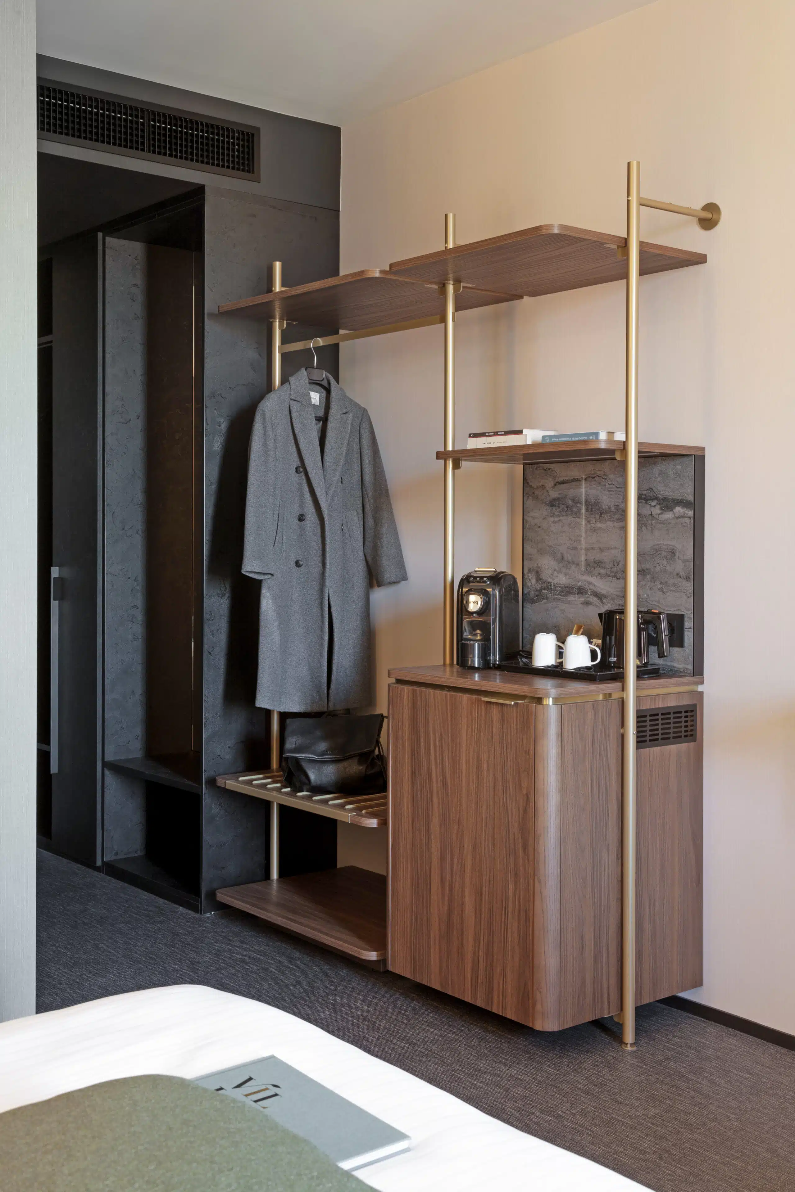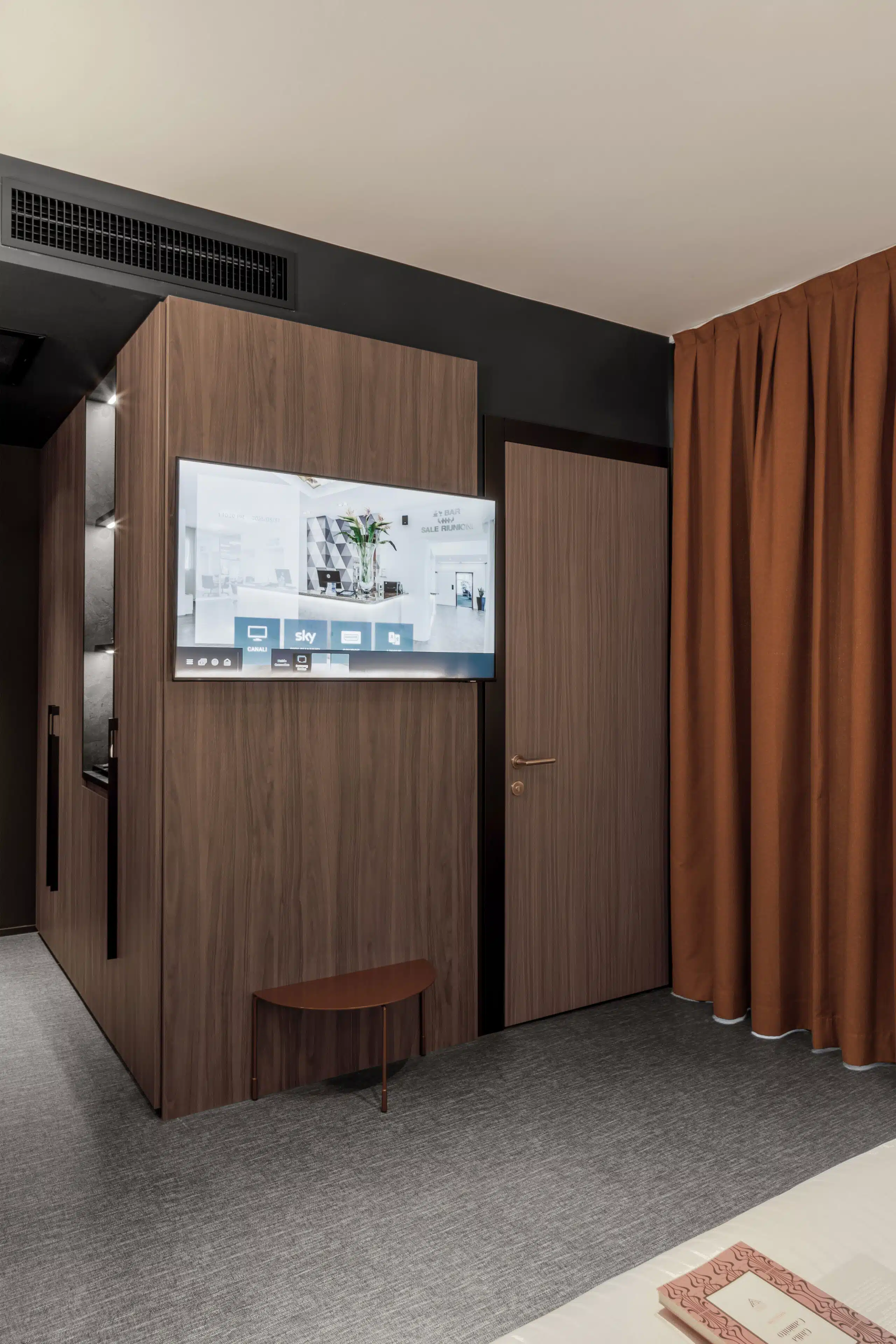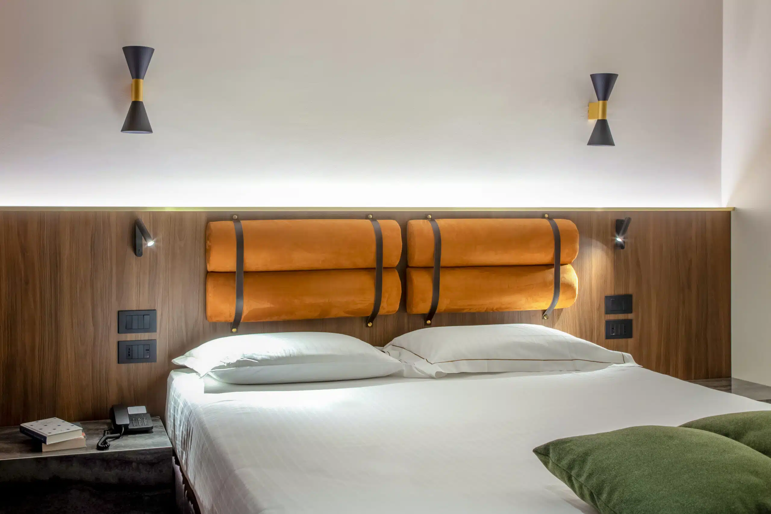 Le Junior Suite reinterpretano la stessa filosofia in spazi più compatti, mantenendo l’attenzione al dettaglio: boiserie coordinate, illuminazione integrata, materiali materici e colori caldi che valorizzano la luce naturale. Nelle camere Standard, la funzionalità incontra l’essenzialità con scrivanie e mensole a muro, armadi a giorno retroilluminati, e testate imbottite con LED integrato, mantenendo la stessa coerenza estetica dell’intero progetto.