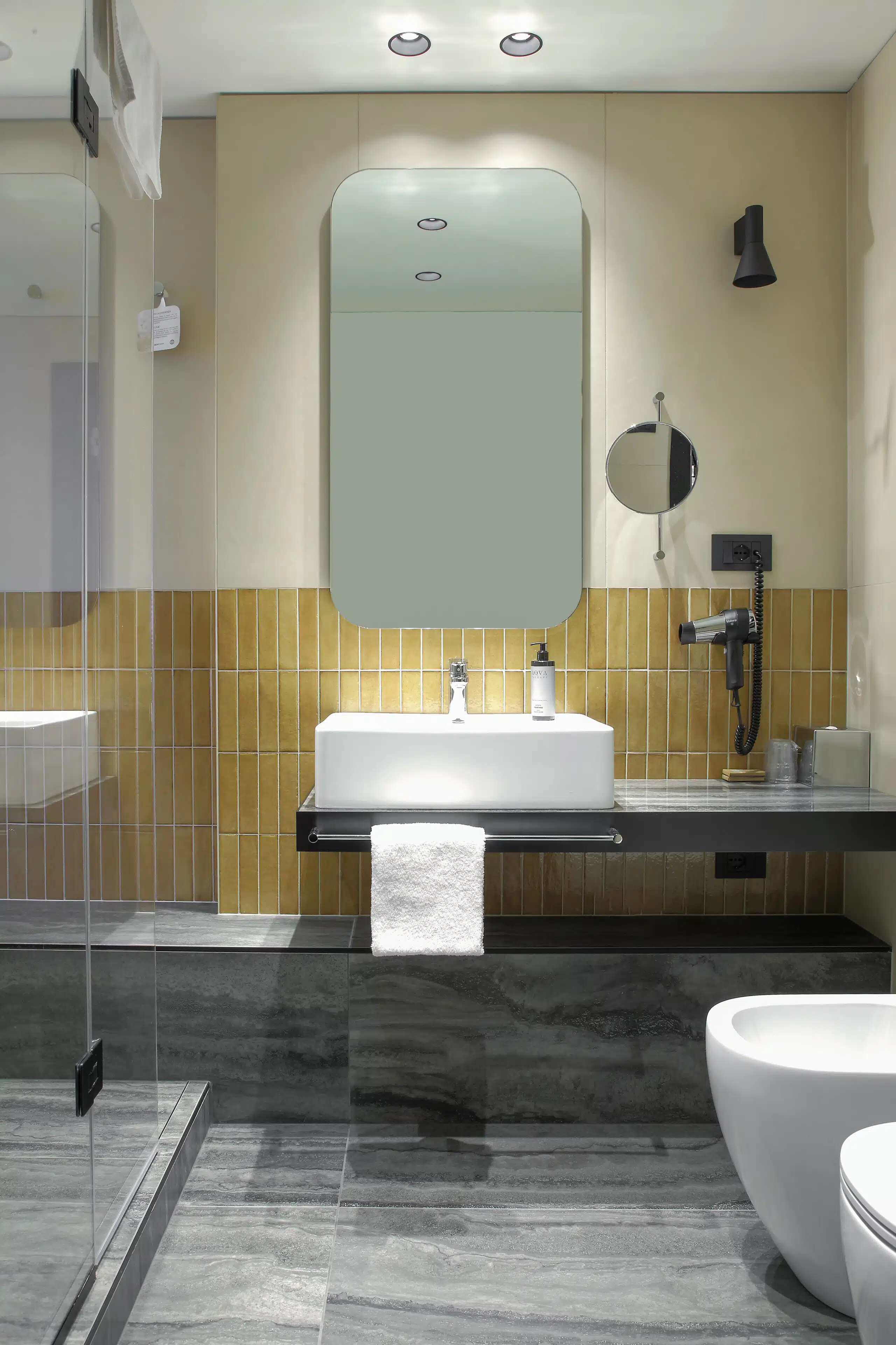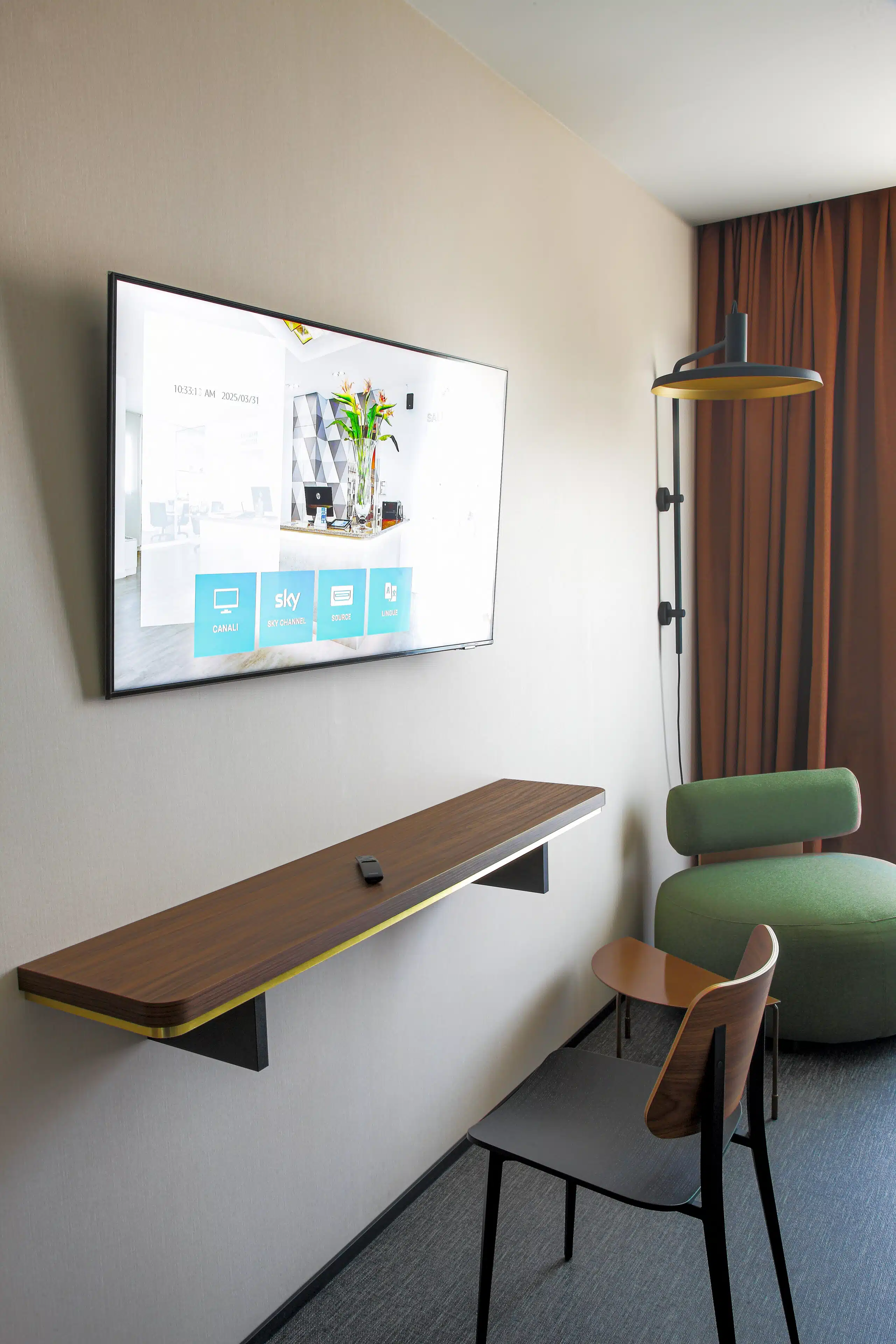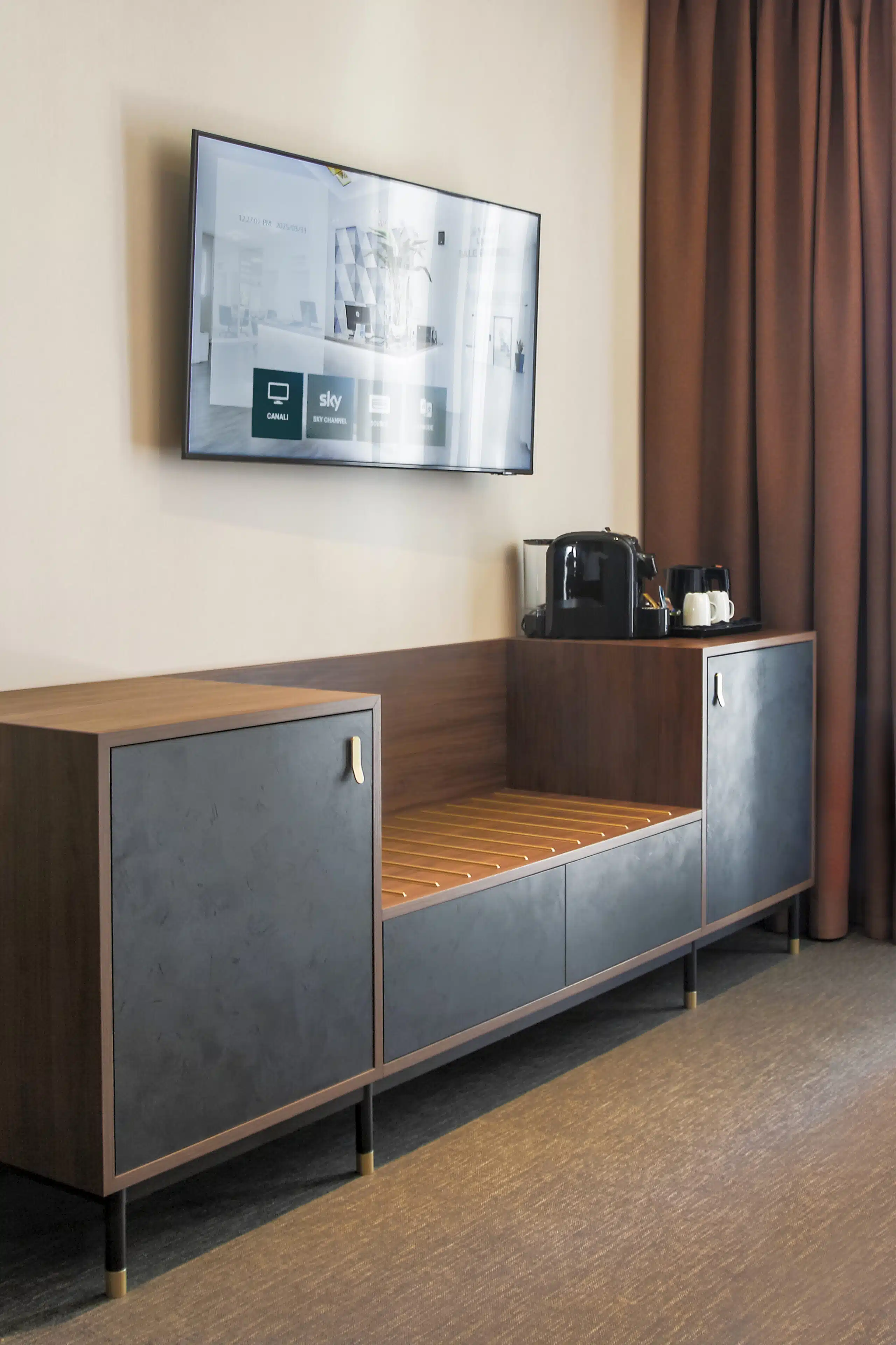 Le Junior Suite reinterpretano la stessa filosofia in spazi più compatti, mantenendo l’attenzione al dettaglio: boiserie coordinate, illuminazione integrata, materiali materici e colori caldi che valorizzano la luce naturale. Nelle camere Standard, la funzionalità incontra l’essenzialità con scrivanie e mensole a muro, armadi a giorno retroilluminati, e testate imbottite con LED integrato, mantenendo la stessa coerenza estetica dell’intero progetto.