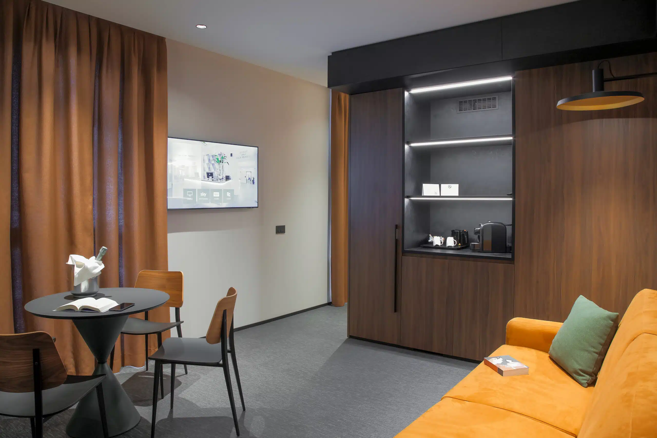 Le Suite, ampie e luminose, sono concepite come vere e proprie zone living: dotate di armadi attrezzati con illuminazione LED a sensore, consolle con porta valigie e vani funzionali, divani letto e tavolini bassi, completati da testate letto retroilluminate, comodini rivestiti in gres e scrivanie integrate sotto TV. I bagni, eleganti e pratici, dialogano armoniosamente con il resto dell’arredamento della camera.