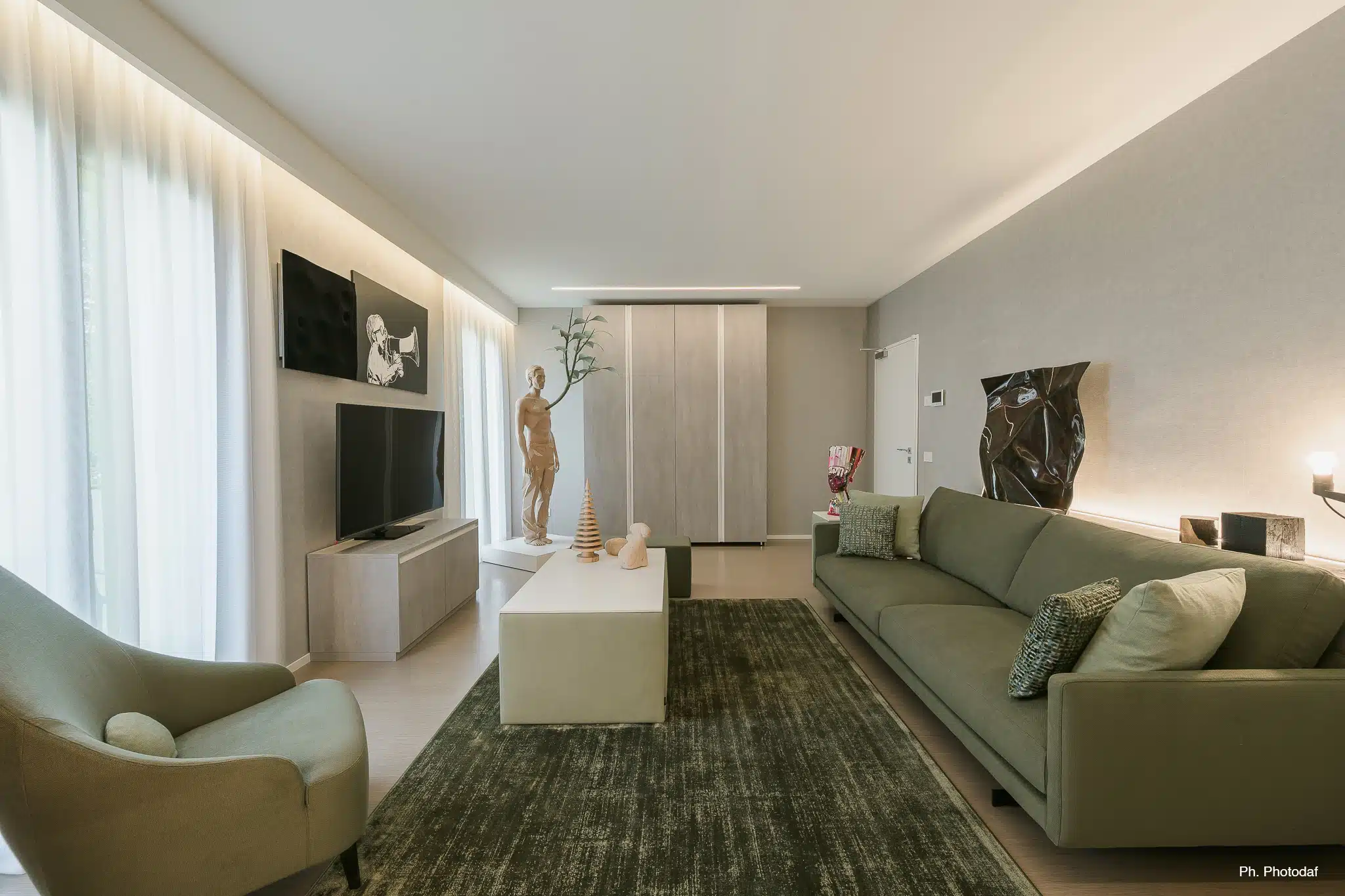 Il progetto adotta un approccio sostenibile a 360°: pannelli ecologici 100% riciclati, tessuti rigenerati da fibre plastiche e tessili, legni certificati FSC® provenienti da foreste gestite in modo responsabile. Le luci LED a basso consumo, i tappeti in fibre naturali e le superfici antibatteriche e facili da mantenere definiscono un ambiente funzionale e accogliente. In aggiunta, un percorso sensoriale che combina aroma di legno di cedro e purificatori d’aria trasforma la stanza in un rifugio di equilibrio e bellezza.