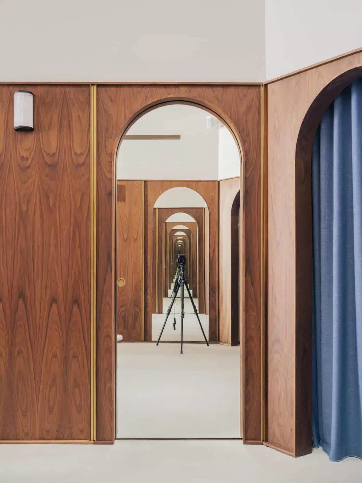 L’eleganza senza tempo del negozio prende vita grazie ai mobili realizzati su misura: il legno di noce Canaletto è il protagonista di questo allestimento, insieme alla tenue tonalità di blu del tessuto che ricopre la boiserie e con le quali sono realizzate la tende dei camerini.